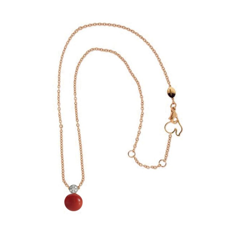 Collana Bon Bon in oro rosa 18Kt, diamanti e corallo rosso. Oro 6,50 GR Diamante 0,13 CT Corallo 1,30 GR. Essendo un prodotto fatto a mano le caratteristiche sopra indicate possono subire leggere variazioni.