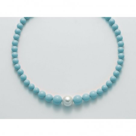 La collana Miluna Au+Ag+Pc+Aggl è un gioiello raffinato realizzato in argento 925/1000 e oro 750/1000. Presenta una perla vera di Oriente con nucleo di colore bianco e agglomerati di colore turchese di diverse dimensioni (mm 8, 10, 12). Questo elegante accessorio combina la bellezza del mare e della terra, rendendolo perfetto per ogni occasione.