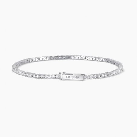 Bracciale tennis in argento con zirconi. • Incastonatura degli zirconi a griffe • Diametro degli zirconi: 2 mm • Chiusura a pinza con molla • Misura medium, lunghezza 18 cm • Materiale: Argento 925, Zirconi