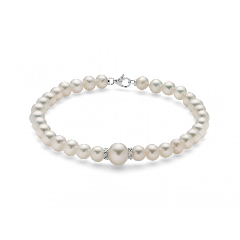 Scopri il raffinato bracciale di Miluna, realizzato con perle vere Oriente di dimensioni 5-5,5 mm e una perla centrale di 7,5-8 mm. Il design è arricchito da sei diamanti naturali taglio brillante rotondo, per un totale di 0,040 ct, incastonati in oro bianco 750. Questo gioiello è perfetto per aggiungere un tocco di eleganza e lusso a qualsiasi outfit, ideale per occasioni speciali o come regalo prezioso.