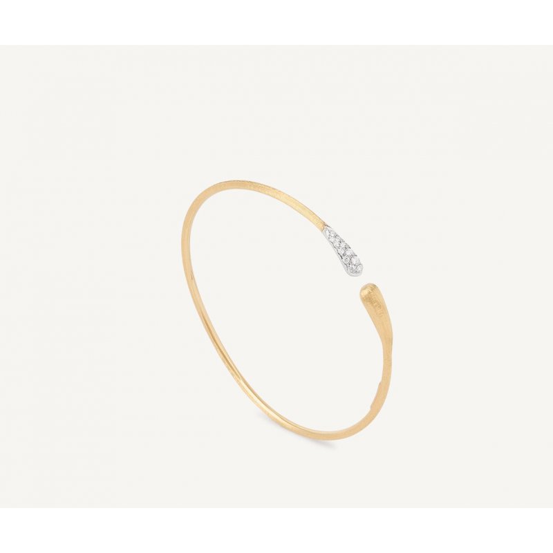Scopri il raffinato bracciale rigido di Marco Bicego, realizzato in oro giallo 18kt e impreziosito da una goccia di pavé di diamanti taglio brillante. Questo gioiello, inciso a mano con l'antica tecnica del bulino millerighe, rappresenta l'eleganza e la delicatezza, perfetto da indossare da solo o in abbinamento con altri gioielli della collezione Marco Bicego.