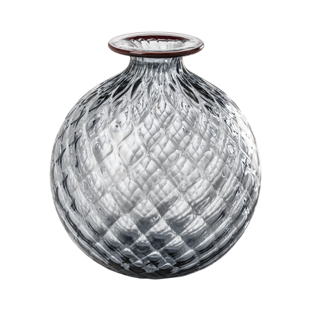 Sembra morbido, eppure è vetro. L'illusione ottica del Monofiori di VENINI del 1970 è nel suo nome: Balloton, la lavorazione unica che ricrea sulla superficie l'effetto matelassé. L'opera è lavorata a mano, soffiata nel caratteristico stampo in metallo e finita nel collo sottile con un filo colorato applicato a caldo, che varia nel colore.