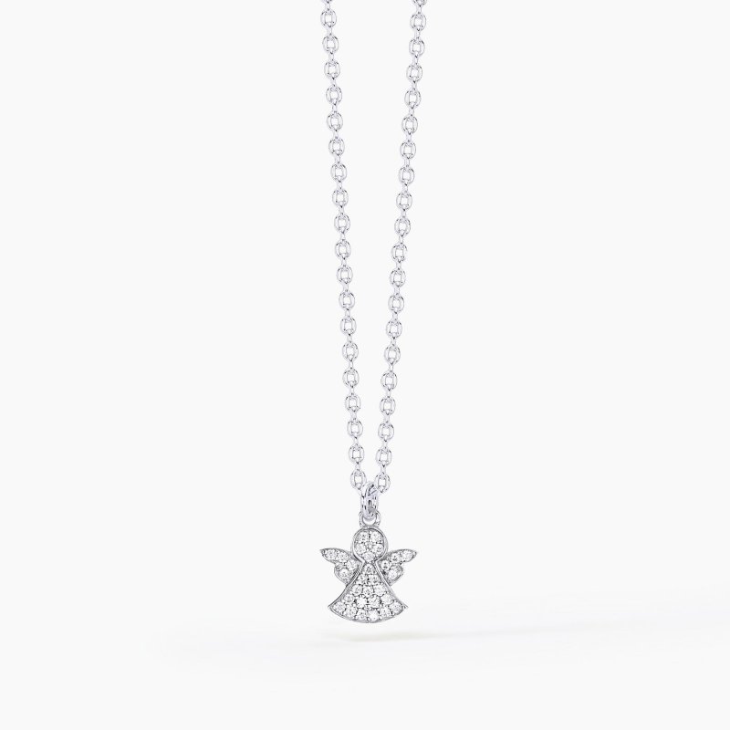 Girocollo in argento con ciondolo a forma di angelo in pavé di zirconi. Chiusura con moschettone. Misura regolabile.