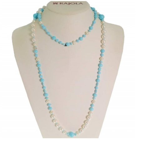 Collana in oro 120cm con perle bianche e pasta turchese, Rajola.