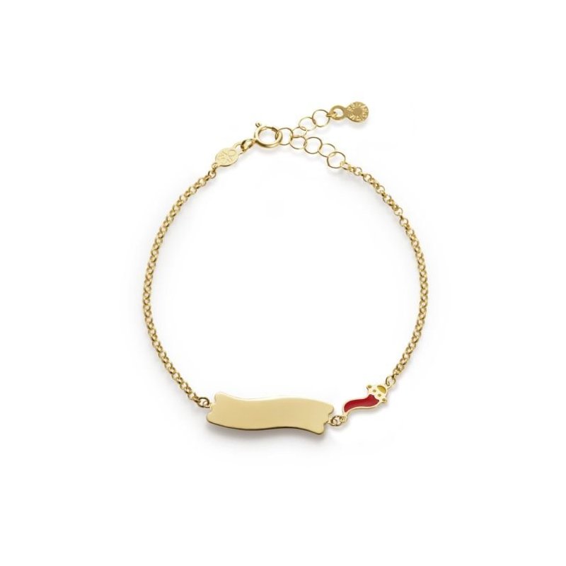 Bracciale Fortuna in oro giallo 9kt con cornetto smaltato e targhetta, lunghezza regolabile.