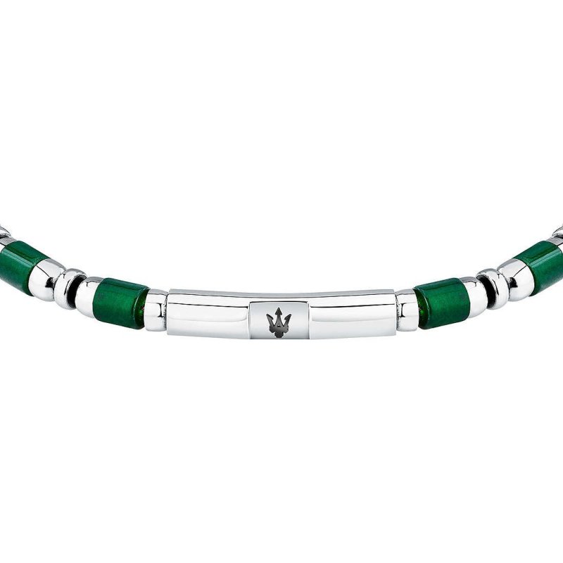 Bracciale da uomo di Maserati della collezione Iconic. Gioiello in acciaio di colore argento. Pietra di colore verde. Chiusura a incastro. Misura gioiello: 18.5|3cm. La referenza è JM334AVD48