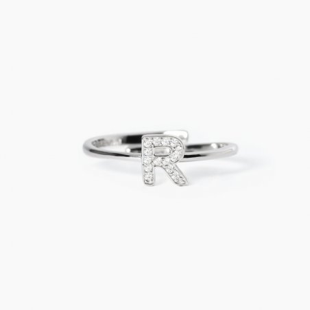 Anello in argento con lettera R in zirconi. • Misura regolabile dalla taglia 11 alla 19 • Materiale: Argento 925, Zirconi