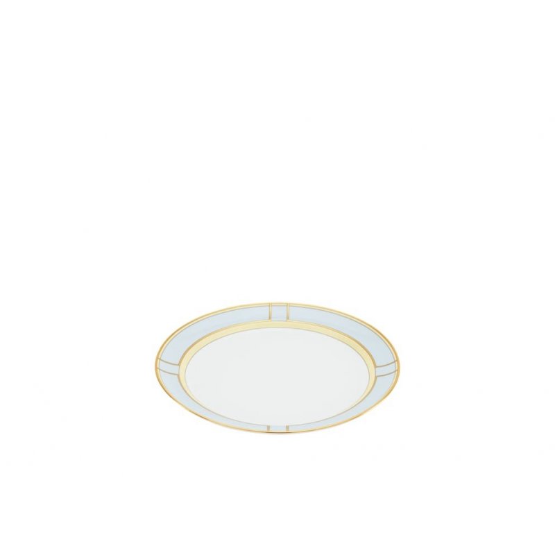 Piatti piani in porcellana bianca con motivo celeste e giallo, filettatura in oro.