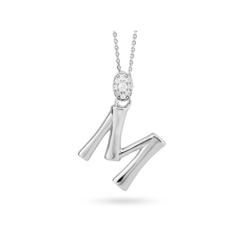 Collana in argento, modello girocollo, con lettera M pendente e contromaglia di zirconi.