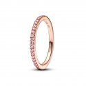 Dona al tuo look un tocco luminoso e delicato con questo Anello Pavè Fascia Sottile. Realizzato con placcatura in Oro Rosa 14k, l'anello è decorato da una fila di pietre di zirconia cubica rosa sull'esterno della metà anteriore. All'interno è inciso l'iconico logo Pandora. Indossalo da solo o con altri gioielli decorati con pavé della collezione Timeless per creare un effetto luminoso.