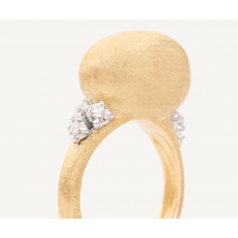 Questo anello in oro giallo 18 carati, dalla superficie irregolare e setosa al tatto, è finemente inciso a mano con l'antica tecnica del bulino millerighe. Il gambo è impreziosito da tre diamanti taglio brillante su ciascun lato che creano uno delicato motivo floreale, aggiungendo un tocco di glamour.