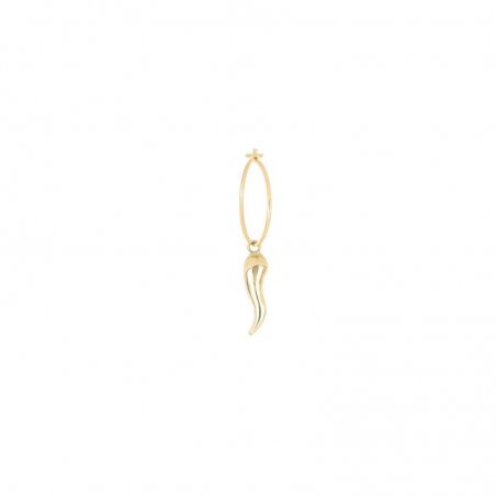 Orecchino a cerchio in oro giallo 18Kt con cornetto pendente, diametro 13 mm.