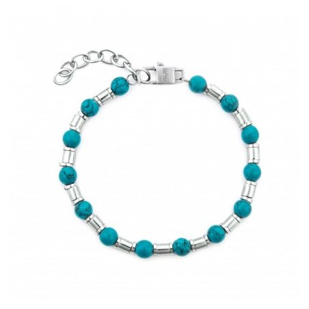 Braccialetto realizzato in acciaio anallergico con finitura rodiata e sfere in turchese. Ha lunghezza totale di 22 cm, regolabile . Chiusura a moschettone.