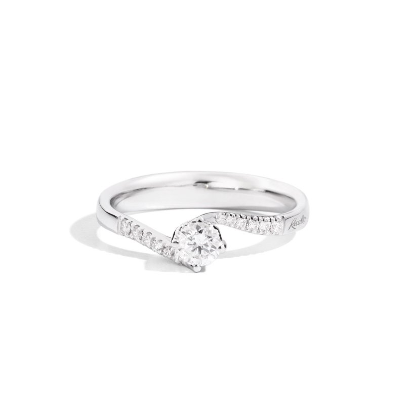 Anello solitario in oro bianco 18 Kt, diamante taglio brillante e pavè di diamanti.