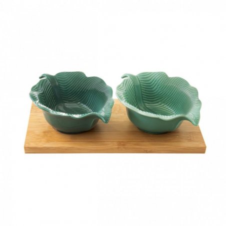 Set aperitivo esotico con vassoio in bambù e ciotole in porcellana a forma di foglia.