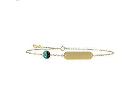 Bracciale da bambina di Nanan, realizzato in oro 9 Kt. Questo elegante gioiello presenta una targhetta personalizzabile e una coccinella turchese, rendendolo un accessorio unico e speciale. Il bracciale ha una lunghezza massima di 15 cm ed è dotato di una chiusura a moschettone per una maggiore sicurezza. L'incisione è inclusa nel prezzo e viene effettuata dal nostro laboratorio al momento dell'ordine, garantendo un tocco personale e distintivo.