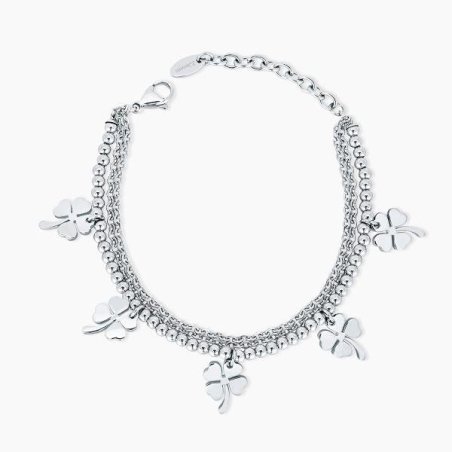 Bracciale in acciaio 316L con doppia catena e pendente quadrifoglio firmato 2 Jewels.