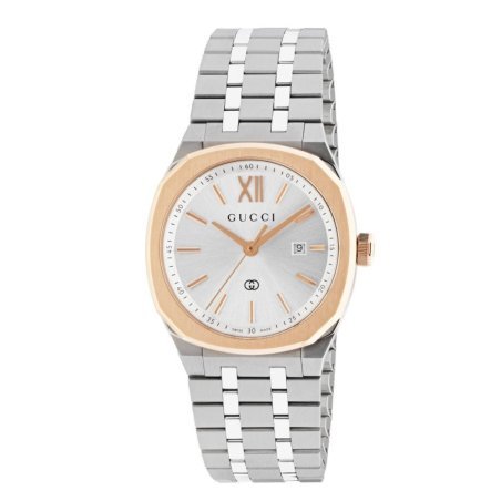 30 mm stainless steel multi layered case, pink gold-plated bezel, silver dial, date opening, stainless steel five links interchangeable bracelet, quartz movement