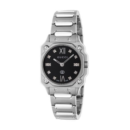 24 mm stainless steel case, black galvanized dial, roman indexes at 12 and 6 o’clock, diamond indexes, stainless steel bracelet, quartz movement