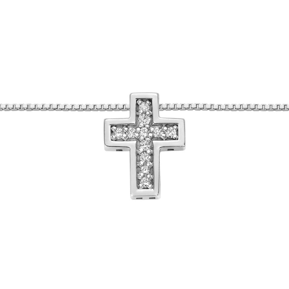 Questa elegante collana presenta un pendente a forma di croce realizzato in oro bianco 18 Kt, impreziosito da brillanti per un totale di 0,04 carati. La catenina veneziana è regolabile, permettendo una lunghezza personalizzata tra 40 e 42 cm. Perfetta per aggiungere un tocco di raffinatezza a qualsiasi outfit, questa collana è un simbolo di stile e grazia. Ideale per occasioni speciali o come regalo significativo, il design classico e senza tempo di questa collana la rende un pezzo essenziale nel guardaroba di ogni donna.