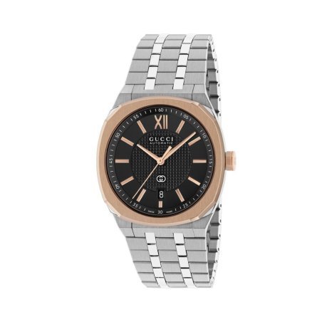 40 mm stainless steel multi layered case, pink gold-plated bezel, black dial, stainless steel interchangeable bracelet, automatic movement