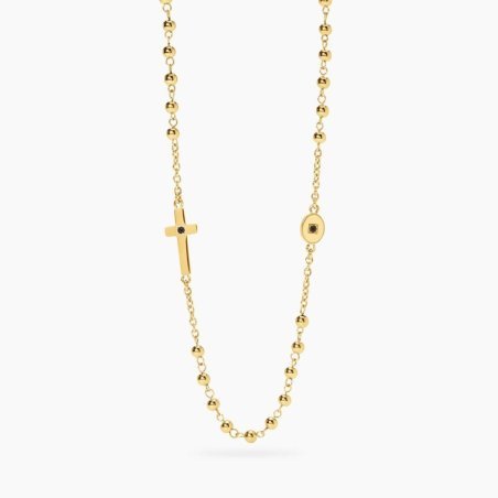 Questa elegante collana di Kidult è realizzata in acciaio 316L con un raffinato rivestimento Pvd giallo. La collana misura 50 cm di lunghezza e presenta una catena forzatina con sfere, elementi ovali e una croce, tutti impreziositi da cristalli neri. Le dimensioni dettagliate includono una larghezza della catena di 2 mm, sfere con un diametro di 4 mm, un ovale di 9x7 mm, una croce di 20x9.5 mm e pietre con un diametro di 2 mm. Perfetta per aggiungere un tocco di eleganza e stile a qualsiasi outfit.