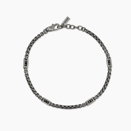 Scopri il raffinato bracciale in argento 925 di Mabina, caratterizzato da una finitura rodiata, sabbiata e brunita. Questo elegante accessorio presenta una catena veneta di 3 mm e elementi di 8.5x3.8 mm, impreziositi da zirconi neri taglio quadrato di 2x2 mm. La lunghezza è regolabile da 19 a 21 cm, rendendolo perfetto per ogni occasione.