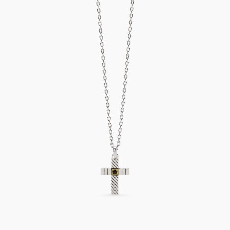 Scopri la collana in argento 925/°°° rodiato di Mabina, caratterizzata da una catena forzatina di 1.5 mm e un pendente a forma di croce di dimensioni 12x14.8 mm. Il pendente è lucido e placcato in oro 18K, arricchito da un zircone nero di Ø 1.75 mm. La lunghezza totale della collana è di 50 cm, perfetta per aggiungere un tocco di eleganza e raffinatezza al tuo look quotidiano.