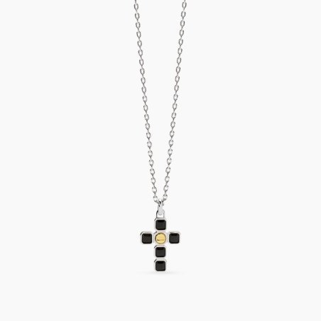 Scopri la collana in argento 925/°°° rodiato di Mabina, caratterizzata da una catena forzatina diamantata di 1.5 mm e un pendente a croce di 12x16 mm. Il pendente presenta una vite centrale di Ø 3 mm placcata in oro 18K e zirconi neri taglio carré ottagonale di 3x3 mm. La lunghezza totale della collana è di 50 cm, rendendola un accessorio elegante e raffinato per ogni occasione.