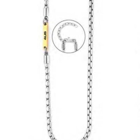 Collana da uomo in acciaio con maglia tubolare e targhetta oro PVD, regolabile.