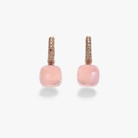 Orecchini in oro rosa e bianco 18K con 2 quarzi rosa, 2 calcedoni e 56 diamanti brown.