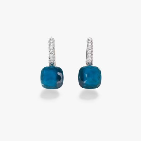 Nudo è la quintessenza dello stile Pomellato e la creazione più emblematica della Maison. Frutto dell'idea rivoluzionaria di liberare la gemma dal castone per esaltarne tutto il suo splendore, la gemma Nudo evoca in ogni sfaccettatura lo spirito giocoso e colorato di Pomellato e l'eleganza understated milanese. Semplici ma eleganti, questi orecchini a goccia lasciano oscillare i topazi Blue London al minimo movimento del capo, catturando la luce in tutte le direzioni. Due frammenti d'infinito per illuminare la vita di tutti i giorni, impreziositi da un pavé di diamanti bianchi.