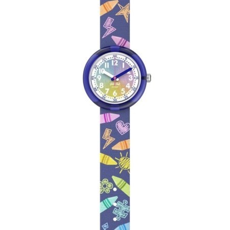 L'orologio RAINBOW CRAYONS di Flik Flak è un regalo educativo che stimola la creatività dei bambini e li aiuta a imparare a leggere l'ora. Con un design vivace di pastelli colorati e scarabocchi, questo orologio è perfetto per i piccoli esploratori. Realizzato con materiali di origine biologica e PET riciclato, è impermeabile fino a 3 Bar e presenta un movimento al quarzo affidabile. Parte della collezione FLIK FLAK CLASSROOM CREATIONS, è un accessorio divertente e funzionale per ogni bambino.