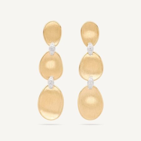Gli orecchini tripli della collezione LUNARIA DIAMONDS di Marco Bicego sono un esempio di semplicità e sofisticatezza. Realizzati in oro giallo 18 carati, presentano foglie finemente incise a mano con l'antica tecnica del bulino millerighe. Gli elementi in pavé di diamanti, che collegano le foglie, aggiungono un tocco di luce delicato, arricchendo le linee organiche del design. Con una lunghezza di 5 cm e una caratura totale di diamanti di 0,072 ct, questi orecchini sono perfetti per chi cerca eleganza e raffinatezza.