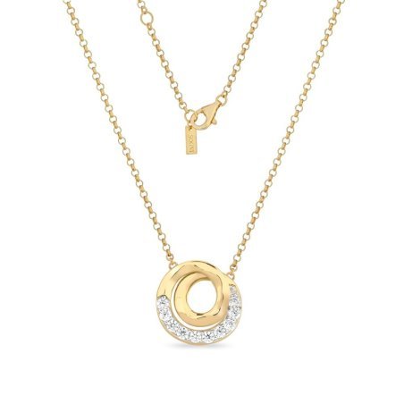 Questa collana delicata con ciondolo a cerchio rappresenta l'equilibrio perfetto tra semplicità e raffinatezza. La catena dorata sottile sostiene un elegante ciondolo circolare dove l'oro caldo incontra la brillantezza dei zirconi, creando un accessorio versatile che completa ogni look con discreta eleganza. Il ciondolo a cerchio combina superfici dorate lucide con una sezione tempestata di zirconi scintillanti, creando un gioco di luci che cattura l'attenzione senza essere eccessivo.