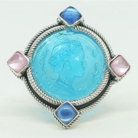 Anello in argento 925 con volto di Hera e pietre preziose, firmato Gerardo Sacco.