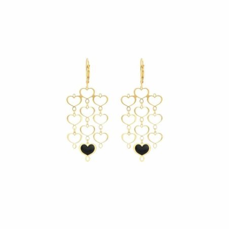 Questa coppia di orecchini a monachella di Maman Et Sophie è un esempio di eleganza e stile. Ogni orecchino presenta una cascata di cuori maman pendenti, culminando in un cuore maman smaltato in nero. Realizzati in argento 925 con una galvanica in oro giallo ad alto spessore e resistenza, questi orecchini sono progettati per durare nel tempo. La lunghezza totale di ogni orecchino è di 5,5 cm, rendendoli un accessorio perfetto per ogni occasione.