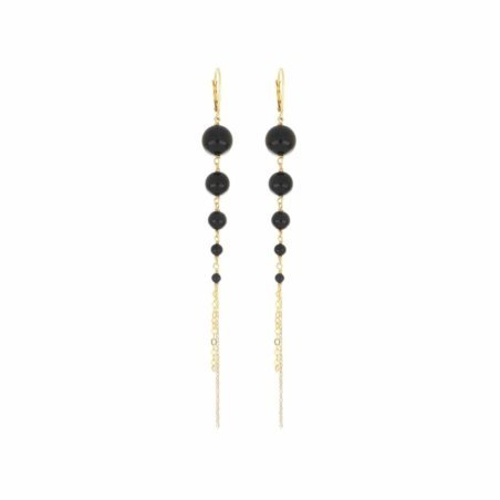 Scopri la coppia di orecchini Onda Bold di Maman Et Sophie, caratterizzati da un design elegante e sofisticato. Realizzati in argento 925 con una placcatura in oro giallo ad alto spessore, questi orecchini presentano cinque pietre di agata nera liscia disposte in dimensioni crescenti, completate da catene finali. La lunghezza totale di ciascun orecchino è di 11,5 cm, offrendo un look distintivo e raffinato. Perfetti per aggiungere un tocco di classe a qualsiasi outfit.