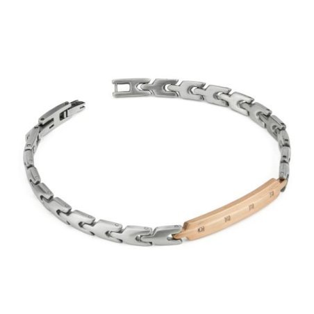 Bracciale in acciaio 316L con maglia a 'Y', centrale placcato oro rosa e quattro zirconi incastonati.