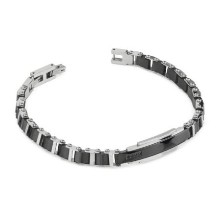 Bracciale in acciaio 316L con moduli e fasce in PVD nero, centrale lucido e zirconi neri.