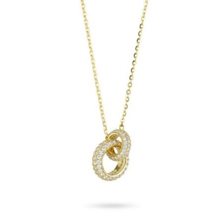 Girocollo in argento placcato oro giallo con pendente di due moduli circolari incrociati, in pavè di zirconi.