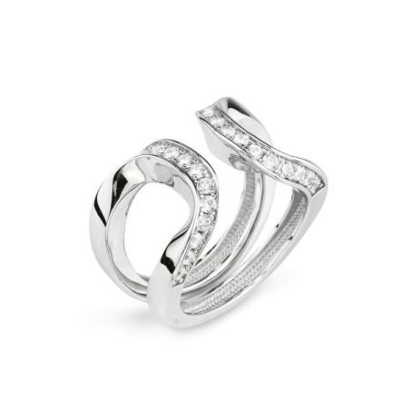 Anello rodiato a fascia doppia aperta con file di zirconi incastonati.