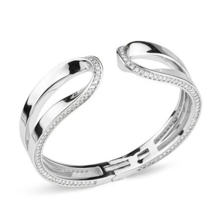 Bracciale rodiato rigido modello a fascia doppia con file di zirconi incastonati.