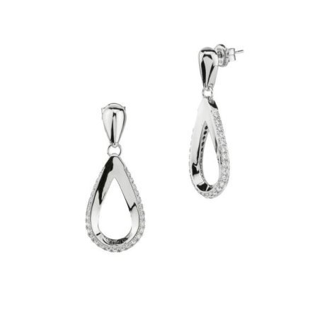 Orecchini rodiati a lobo con pendente a goccia definito da zirconi.