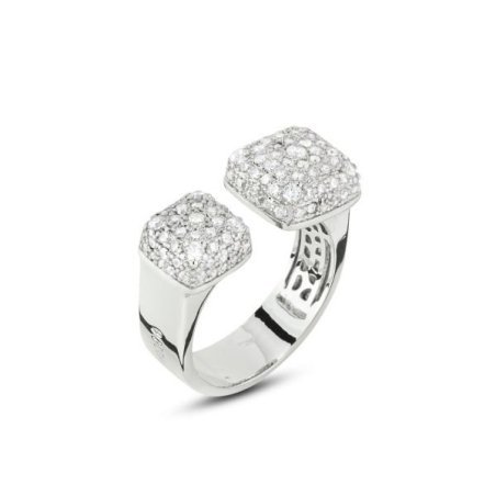Anello rodiato aperto con centrale composto da quadrati grandi in pavè di zirconi e brand Boccadamo laterale.