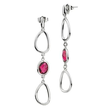 Orecchini pendenti rodiati con moduli a goccia e cristallo taglio briolette di colore rubino.