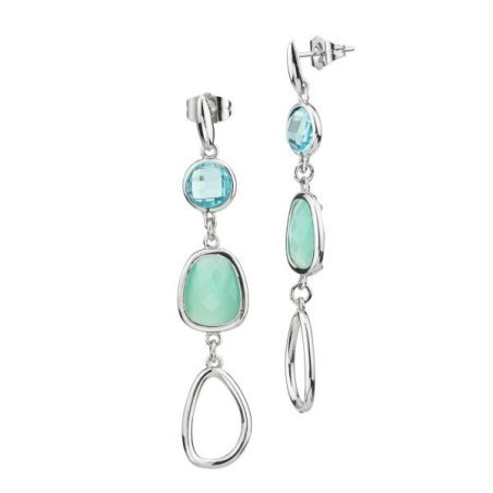 Orecchini pendenti rodiati con cristalli, taglio briolette e cabochon, di colore acquamarina e verde chiaro e modulo a goccia.