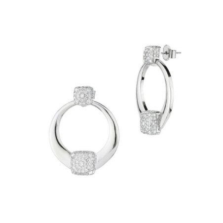 Orecchini rodiati con cerchi grande, quadrato centrale in pavè di zirconi e contromaglia in pavè di zirconi.