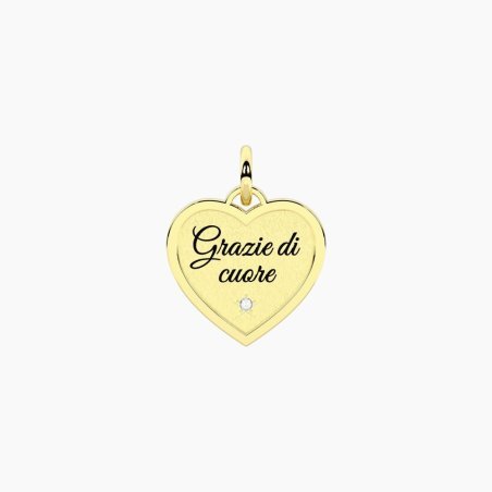 Il ciondolo Grazie Di Cuore di Kidult è un elegante accessorio a forma di cuore, realizzato in acciaio 316L con finitura PVD giallo satinato e lucido. Arricchito da un cristallo bianco di diametro 1,25 mm, presenta una scritta incisa 'Grazie di cuore'. Il retro del ciondolo è ideale per personalizzazioni tramite incisioni. Le dimensioni del ciondolo sono di 15 x 15 mm, rendendolo un gioiello perfetto per esprimere gratitudine con stile.