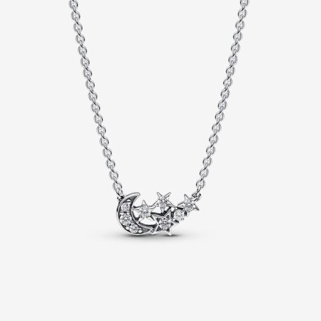 Celebra la magia del cielo stellato con questa Collana Luna Crescente e Stelle. Realizzata in in Argento Sterling 925, questa collana presenta una falce di luna e un gruppo di stelle con contorni in rilievo e decorate da pietre di zirconia cubica incolore. Dalla chiusura, regolabile su due lunghezze, pende una stella a cinque punte decorata da una pietra di zirconia cubica incolore. Indossala da sola o abbinala alle tue collane preferite per portare sempre con te i simboli del cielo.